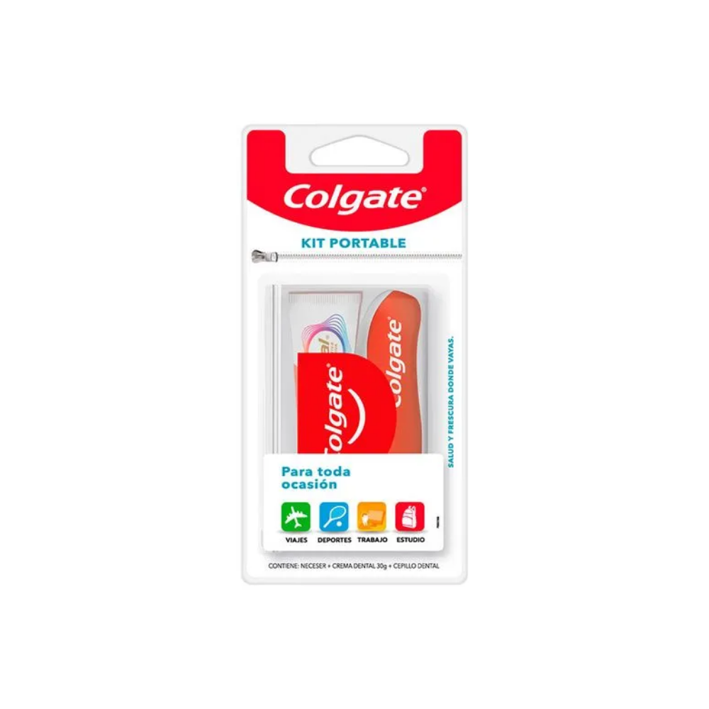 El kit portable Colgate es una solución práctica y funcional para mantener la higiene bucal fuera del hogar, combinando un cepillo dental compacto con una crema dental anticaries en formato viaje.