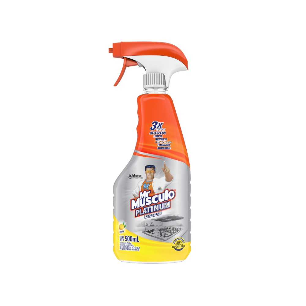 Mr. Músculo Platinum Cocina Gatillo limpia y desengrasa las superficies de la cocina de manera rápida y efectiva, eliminando restos de grasa, suciedad y manchas difíciles. Su presentación de 500 ml con gatillo facilita la aplicación directa en mesadas, hornos, campanas y otras áreas de cocina, optimizando la limpieza.