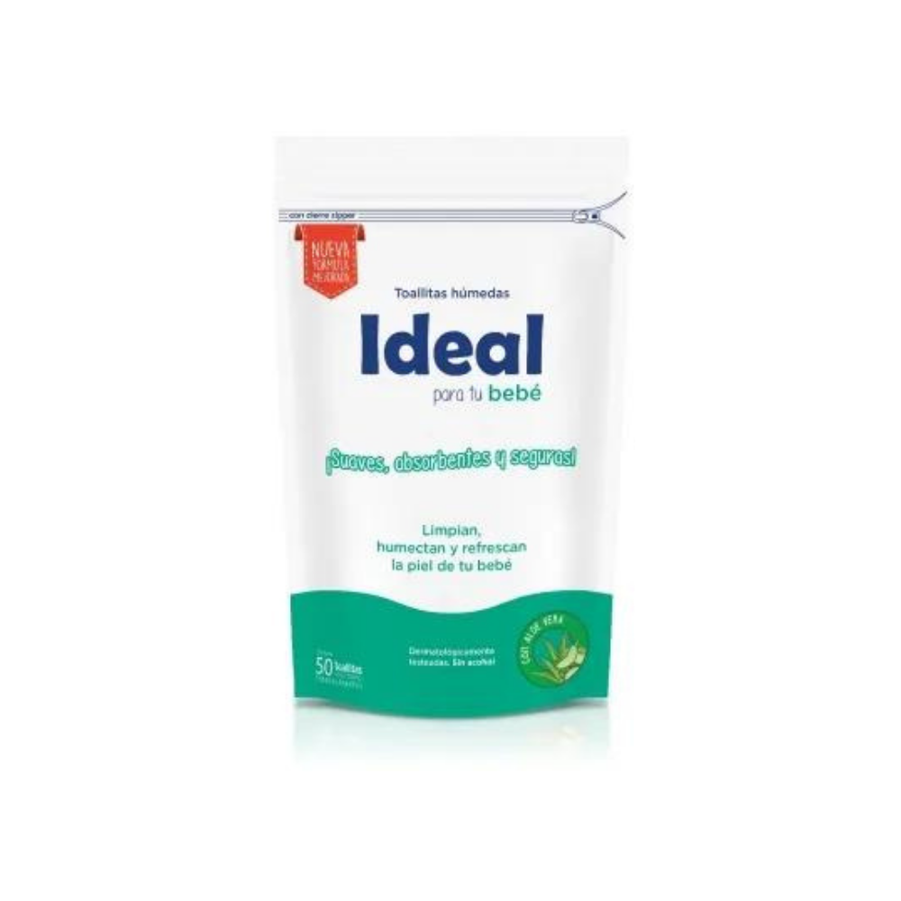 Las toallas húmedas Ideal con aloe vera están formuladas para proporcionar una limpieza refrescante y humectante. Cada pack de 50 unidades está diseñado para cuidar la piel con suavidad.